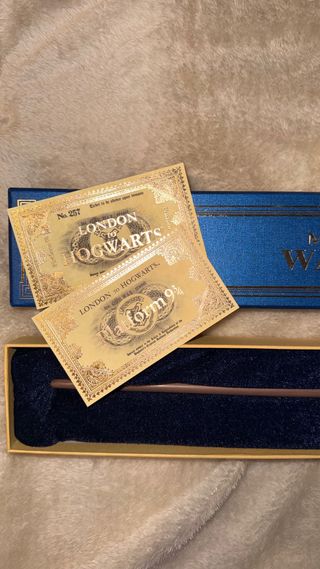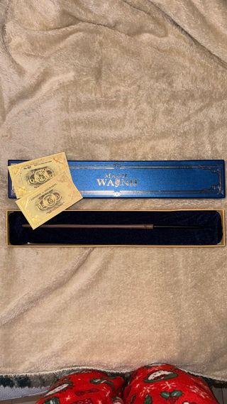 Bacchetta di Draco Malfoy dalla saga di Harry Potter. La bacchetta è riposta nella sua scatola originale blu con dettagli dorati. - Scatola originale inclusa. - Due biglietti dorati con sigillo di Hogwarts.