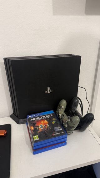 Vendo console PlayStation 4 Pro in colore nero. - Include due controller. - Include i seguenti giochi: Minecraft, Hogwarts Legacy, Marvel Spider-Man.