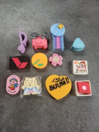 .- Gomma a forma di nota musicale viola. - Gomma a forma di cinepresa rosa. - Gomma a forma di triangolo azzurro. - Gomma rettangolare nera con logo . - Gomma a forma di cuore gialla con scritta. Alcune gomme sono del Mulino Bianco, l'ultima foto con la gomma singola è in regalo.