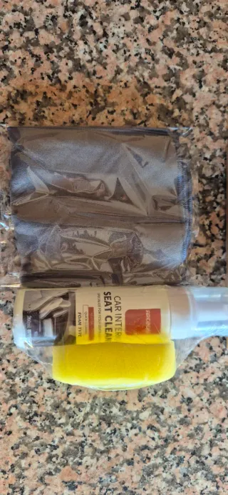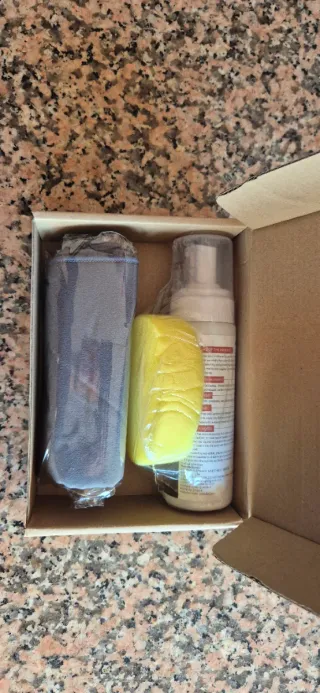 Set per la pulizia degli interni della tua Tesla Model 3. - Detergente in schiuma. - Panno in microfibra. - Spugna applicatrice.