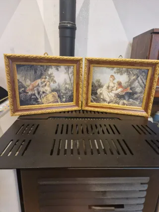 Deliziosa coppia di quadretti decorativi, perfetti per aggiungere un tocco di charme a qualsiasi ambiente. - Cornici in legno con finitura dorata. - Stampe raffiguranti scene romantiche in un contesto naturale.