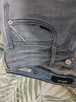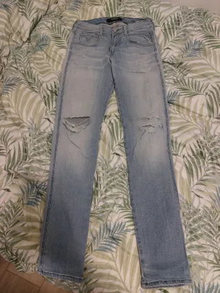 Jeans Replay da uomo in denim blu. Modello con strappi sulle ginocchia e lavaggio effetto used. - Vestibilità slim. - Dettagli con cuciture a vista sui lati. - Tasche frontali e posteriori. Molto comodi ed elasticizzati. Vendo perché stretti
