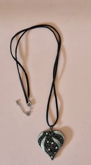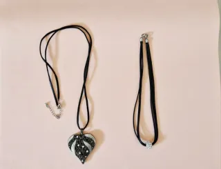 Set di due collane in acciaio inossidabile. - Una collana presenta un pendente a forma di cuore decorato con dettagli argentati e strass. - L'altra collana è un girocollo a più fili con un piccolo ciondolo sferico tempestato di strass.