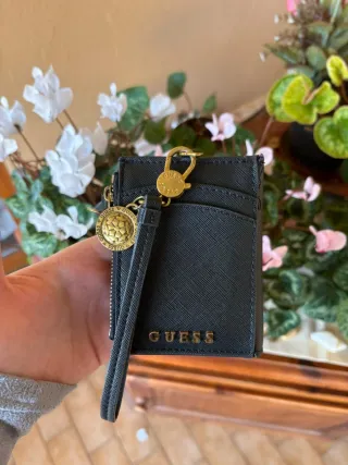 Elegante portafoglio Gu*ss da donna, perfetto per organizzare carte e contanti. - Design compatto e funzionale. - Zip per chiusura sicura. - Slot per carte di credito. - Charm Guess con logo dorato.