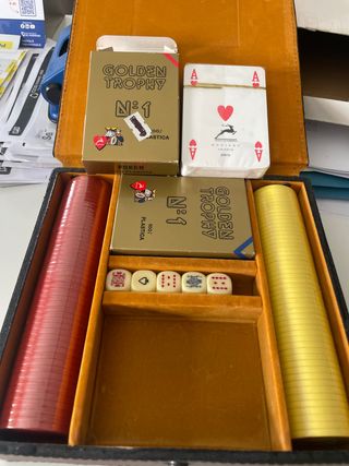 Elegante set da poker completo, contenuto in una valigetta in vera pelle. - Due mazzi di carte da gioco Golden Trophy N°1 100% plastica. - Cinque dadi. - Gettoni da poker rossi e gialli.