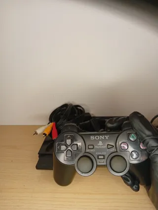 Console per videogiochi in colorazione nera. - Console PlayStation 2 - Controller - Cavi AV (componenti gialli, rossi, bianchi) - Cavo di alimentazione