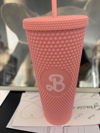 Tazza rosa a tema Barbie The Movie, perfetta per gli appassionati del film. - Design con texture a nido d'ape. - Logo B stilizzato sul fronte. - Include una cannuccia coordinata. 800MI ad alta capacità a doppio strato in plastica