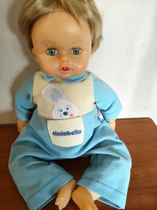 Bambola Cicciobello vintage, un classico per collezionisti e appassionati. - Indossa un pigiamino azzurro con un coniglietto. - Dettaglio cicciobello sul panciotto.