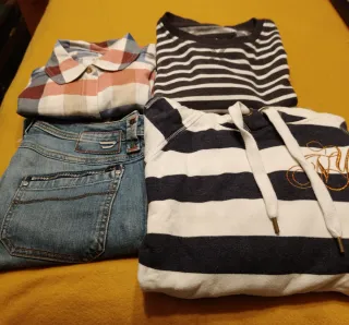 Set composto da quattro capi di abbigliamento. - Camicia a quadri - Jeans - Felpa a righe - Felpa con cappuccio a righe