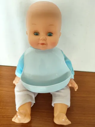 Bambolotto vintage in ottime condizioni, pronto per una nuova casa. - Testa e corpo in plastica. - Indossa un completo azzurro e bianco. - Completo di bavaglino azzurro in plastica
