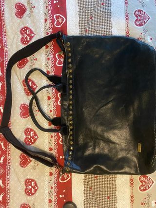 Borsa in pelle con un design unico e dettagli curati. - Materiale: Pelle - Dettagli: Borchie metalliche decorative lungo il bordo superiore - Manici: Due manici corti per portarla a mano - Tracolla: Tracolla regolabile e rimovibile per un uso versatile