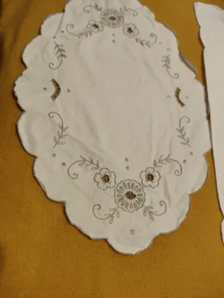 Set di tre centrini in tessuto bianco con ricami floreali ricamati a manoe disegni a rombi .Su quello ovale c'è una macchietta, vedi foto - Ricami floreali su un centrino. - Disegni a rombi su un altro centrino. - Bordo traforato su tutti e tre.