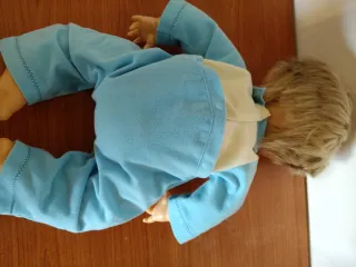 Bambola Cicciobello vintage, un classico per collezionisti e amanti dei giochi retrò. - Capelli biondi. - Occhi azzurri. - Indossa un pigiamino azzurro con bavaglino a tema coniglietto.