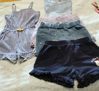 Set composto da 5 capi di abbigliamento per bambina. - Tutina a righe blu e bianche con volant. - Pantaloncini blu scuro con stampa Hello Kitty e volant. - Pantaloncini di jeans con brillantini e bottoni. - Pantaloncini lilla. - Maglietta azzurra.