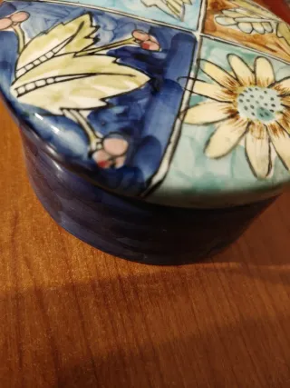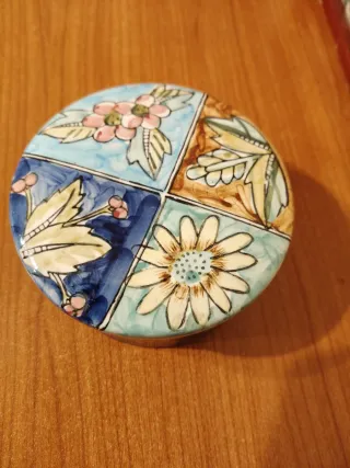 Grazioso portagioie rotondo con un design floreale dipinto a mano. Cm 12x6 - Decorato con fiori e foglie. - Motivo a quadranti con disegni diversi.