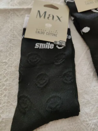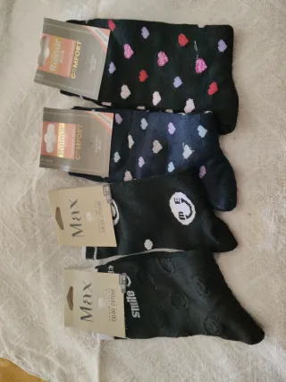Set di quattro paia di calzini con fantasie assortite. - Fantasia a cuori colorati su fondo nero. - Fantasia a pois colorati su fondo blu scuro. - Calzini neri con logo e bianco. - Calzini neri con fantasia a pois in rilievo e scritta smile.