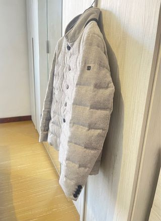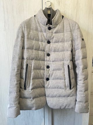 Giacca imbottita di lanna DUNO modello Master T. Nuovo senza etichetta, ho ordinato 2 taglie e questa era troppo grande, ma purtroppo non ho potuto restituirla. Misura 50, La giacca è stata acquistata al prezzo di 690€ - Colore grigio mélange. - Chiusura con bottoni. - Tasche laterali con zip nere. - Collo alto.