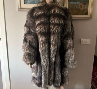 Elegante cappotto in pelliccia sintetica, con un bellissimo gioco di colori tra il nero e l'argento. - Design lungo e voluminoso. - Morbido al tatto. - Fodera interna liscia.