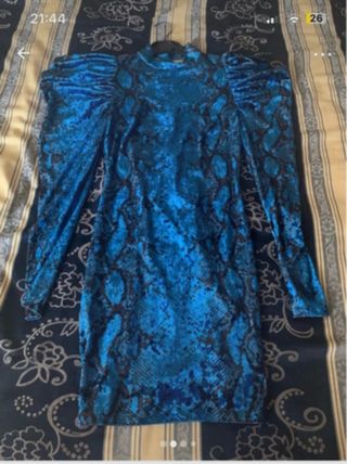 Vestito in velluto con stampa animalier. - Colore bluette e nero. - Maniche lunghe con spalle a sbuffo. - Collo alto.