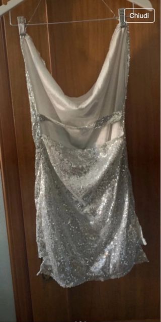 Elegante abito in raso con dettagli scintillanti. - Tessuto in raso liscio. - Orlo con frange di strass argentati. - Design con scollo a V.