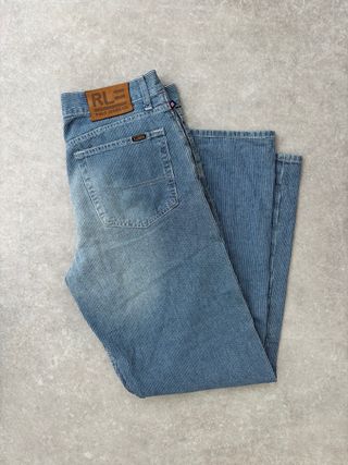Pantaloni in denim a righe blu di Polo Ralph Lauren. - Logo in pelle sul retro. - Tasche posteriori. - Design a righe verticali.