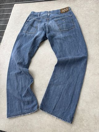 Jeans Armani da uomo in denim blu. Modello baggy con dettagli logo. - Logo AJ ricamato sul taschino posteriore. - Patch logo AJ sul retro in vita. - Tasche posteriori con chiusura a bottone.
