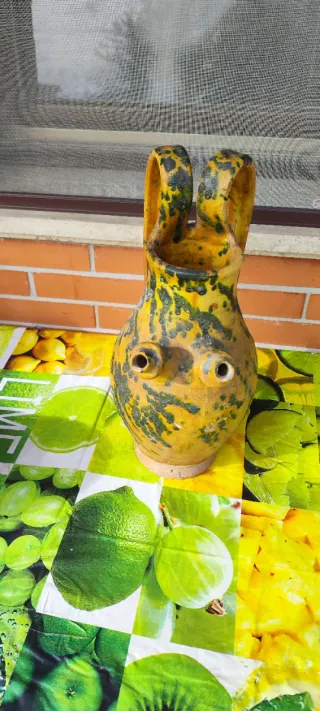 Originale brocca in ceramica dal design unico. - Colore giallo con macchie verdi. - Manici a forma di orecchie. - Due fori frontali che ricordano occhi. - Base in terracotta. - brocca a trabocchetto" (come i modelli "bevi se puoi")