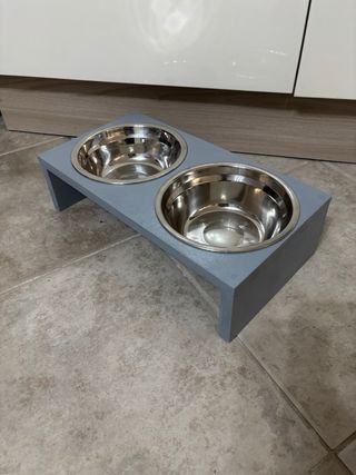 Pratico portaciotole doppio in legno verniciato grigio con due ciotole - Struttura in legno verniciato. - Due ciotole in acciaio - Design moderno e funzionale. Misura altezza 9 profondita 18 cm Lunghezza 34 cm Diametro ciotole 16 cm