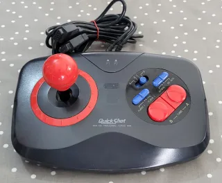 Joystick QuickShot completamente a micro switches compatibile per Commodore, Atari, MSX e SEGA Master System testato e perfettamente funzionante. Il nome del prodotto è " Maverick 1M " dove La M sta per Microswitch, che offre una risposta tattile più precisa rispetto agli interruttori a lamella. Può connettersi simultaneamente a due porte joystick e il giocatore può essere selezionato tramite un interruttore. Ciò consente inoltre di utilizzare potenzialmente il joystick con due sistemi diversi senza dover cambiare i cavi. È dotato di una funzione di fuoco automatico che può essere attivata (probabilmente solo tramite il grilletto A)
