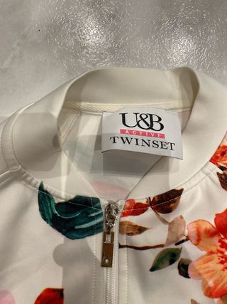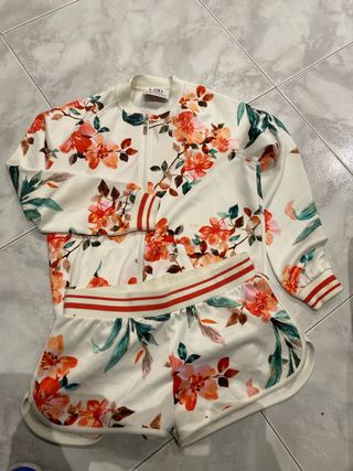 Bellissimo completo Twinset con stampa floreale vivace su fondo bianco. - Giacca sportiva con zip. - Pantaloncino con elastico in vita. - Dettagli a righe rosse sui polsini e in vita.