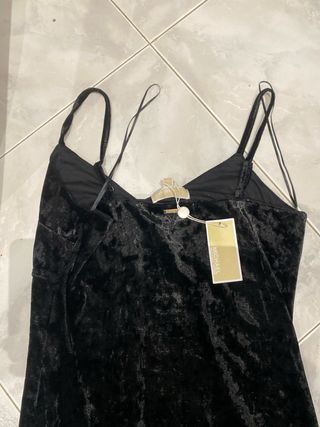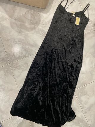 Elegante abito lungo in velluto nero. - Tessuto morbido e lucido. - Spalline sottili. - Taglio svasato.