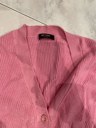 Cardigan Twinset in morbida maglia. - Scollo a V. - Chiusura con bottoni. - Maniche lunghe. - Design a coste.