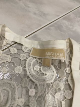 Elegante abito in pizzo bianco con dettagli oro. - Pizzo floreale intricato - Scollo a V con allacciatura dorata - Maniche corte - Lunghezza al ginocchio