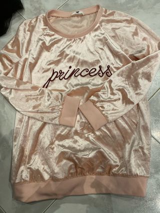 Felpa in morbido tessuto effetto velluto, colore rosa cipria. - Scritta princess ricamata sul davanti. - Maniche lunghe raglan. - Polsini e fondo in maglia a costine.