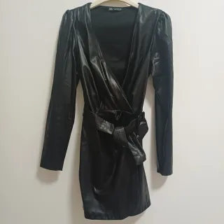 Elegante vestito in ecopelle con cintura. - Maniche lunghe con spalle a sbuffo. - Scollo a V. - Cintura in vita con chiusura a fibbia. - Effetto pelle lucida.