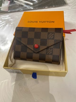Portafoglio Louis Vuitton in tela Damier. - Chiusura con bottone a pressione. - Dettaglio con bottone rosso. - Include scatola originale.