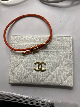 Elegante portacarte Chanel in pelle bianca trapuntata. - Design trapuntato a rombi. - Logo CC dorato applicato. - Diverse fessure per carte.
