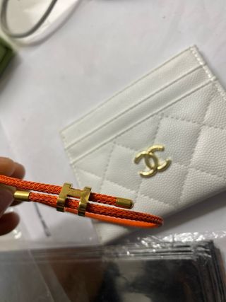 Elegante portacarte Chanel in pelle martellata bianca. Un accessorio raffinato per portare con te le carte essenziali. - Design trapuntato iconico. - Logo CC dorato applicato sul davanti. - Diverse fessure per carte.