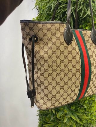 Borsa tote Gucci in tela monogram beige con dettagli in pelle nera e le iconiche strisce Web verde e rossa. - Tela monogram GG. - Dettagli in pelle. - Strisce Web. - Manici in pelle. - Chiusura con laccio.