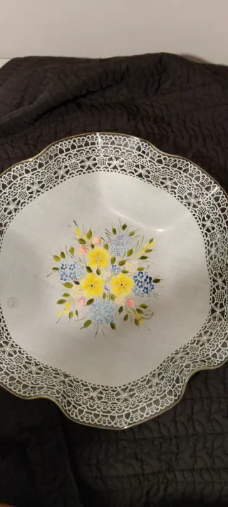 Elegante centrotavola in vetro di Murano, particolare della lavorazione, durante la fusione dei due vetri è stato inserito un centrino dipinto a mano, fiori gialli e blù e il bordo del centro è lavorato a tombolo o all' uncinetto. Diam cm 45 x h cm 10 circa - Decorato con un bouquet di fiori dipinti a mano.