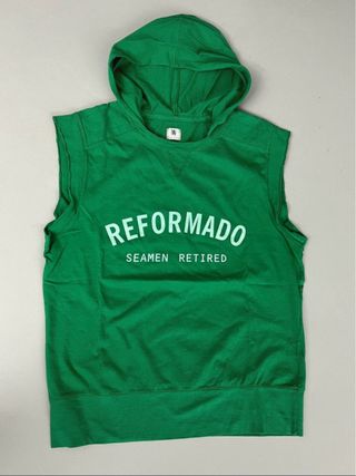 Felpa con cappuccio senza maniche Grifoni. - Colore verde brillante. - Stampa REFORMADO SEAMEN RETIRED sul davanti. - Taglio moderno e casual.