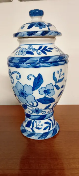 Elegante antico vaso cinese in porcellana con decorazioni floreali blu in varie tonalità. Sul fondo si nota un marchio. Misura 32 cm alt, 50 cm diametro max. Ottime condizioni . Completo di coperchio. - Bordo decorato con motivo a corda.