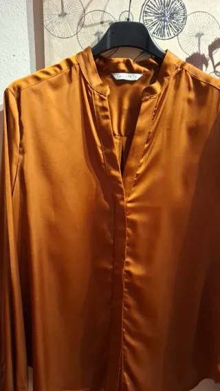 Elegante camicia Calliope in una bellissima tonalità bronzo. Il tessuto ha una finitura lucida che cattura la luce. - Scollo a V con dettaglio. - Maniche lunghe. - Tessuto liscio e setoso.