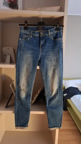 Jeans donna marca Kaos. - Modello skinny. - Effetto used con strappi. - Vita media. - Chiusura con zip e bottone. - Tasche frontali e posteriori.