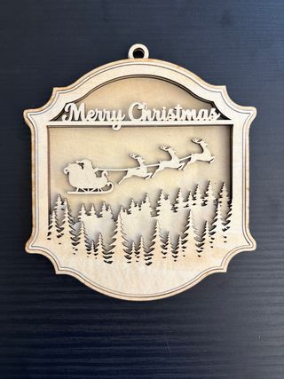 Deliziosa decorazione natalizia in legno, perfetta per aggiungere un tocco magico alla tua casa durante le feste. Larghezza 13,8cm Altezza 15,2 cm - Design a più strati con scena di bosco innevato. - Sagoma di Babbo Natale sulla slitta trainata da renne. - Scritta Merry Christmas incisa. - Ideale per essere personalizzata o dipinta.