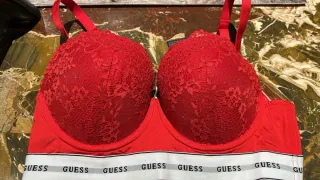 Bellissimo completo intimo Guess da donna. - Tessuto in pizzo floreale. - Fascia elastica con logo. - Spalline regolabili.