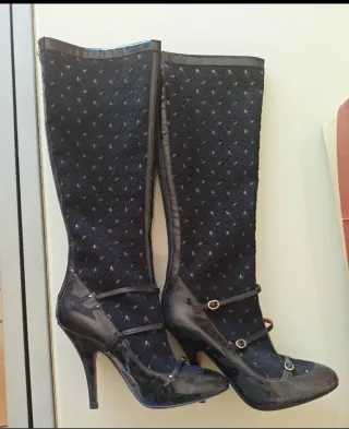 Eleganti stivali alti in pelle di vitello. - Dettagli in tessuto con fantasia. - Inserti lucidi. - Cinturini decorativi con fibbie.