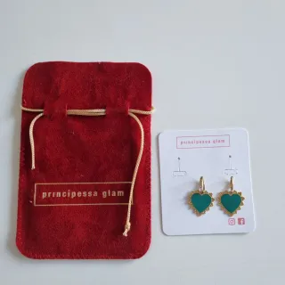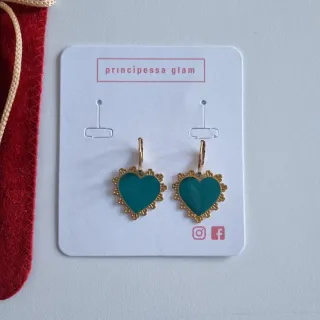 Coppia di orecchini in ottone galvanizzato oro 24k, finitura con smalto color teal e bordo decorato, venduti con confezione come da foto, ottima idea regalo. Nessun difetto. Misura: il cuore è lungo 2 cm per larghezza sempre 2 cm. Con la chiusura a monachella diventano lunghi 3 cm.