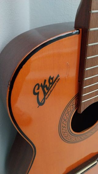 Chitarra acustica Eko con finitura lucida arancione e dettagli neri. - Logo Eko con scritta Made in Recanati, Italy. - Bordatura nera sul corpo. - Rosone decorativo intorno alla buca.