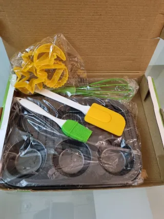 Set da forno completo per tutte le tue esigenze di pasticceria. - Stampo per 6 muffin - Frusta - Spatola - Pennello - 6 tagliabiscotti - nuovi mai usati